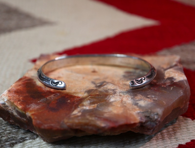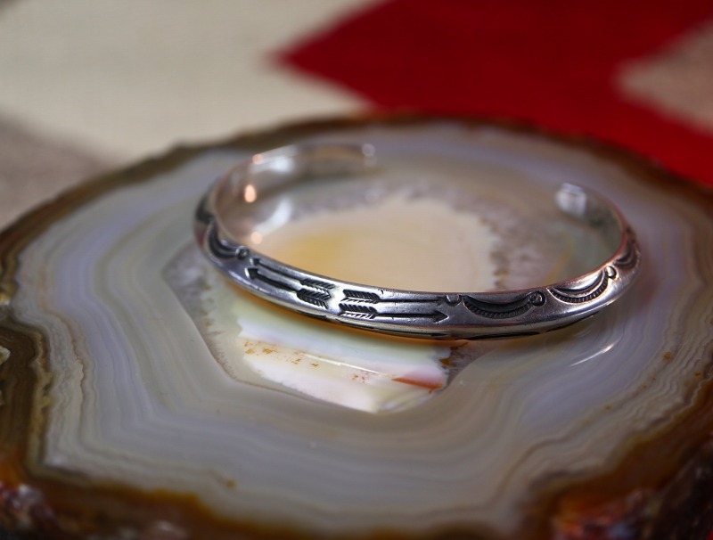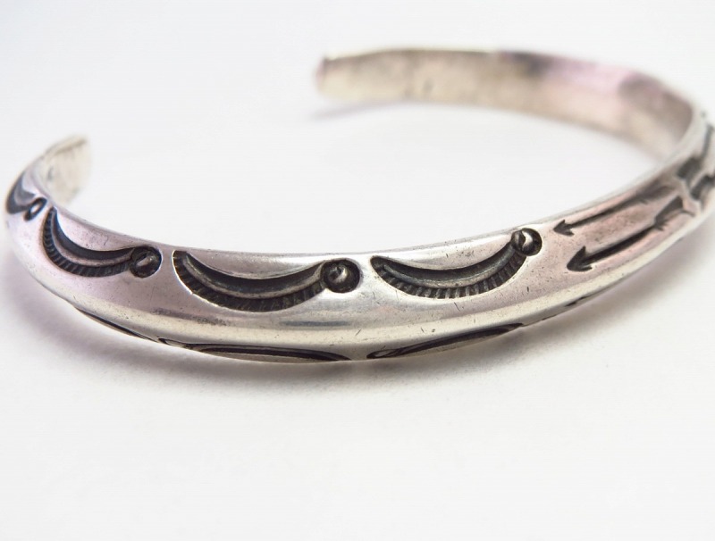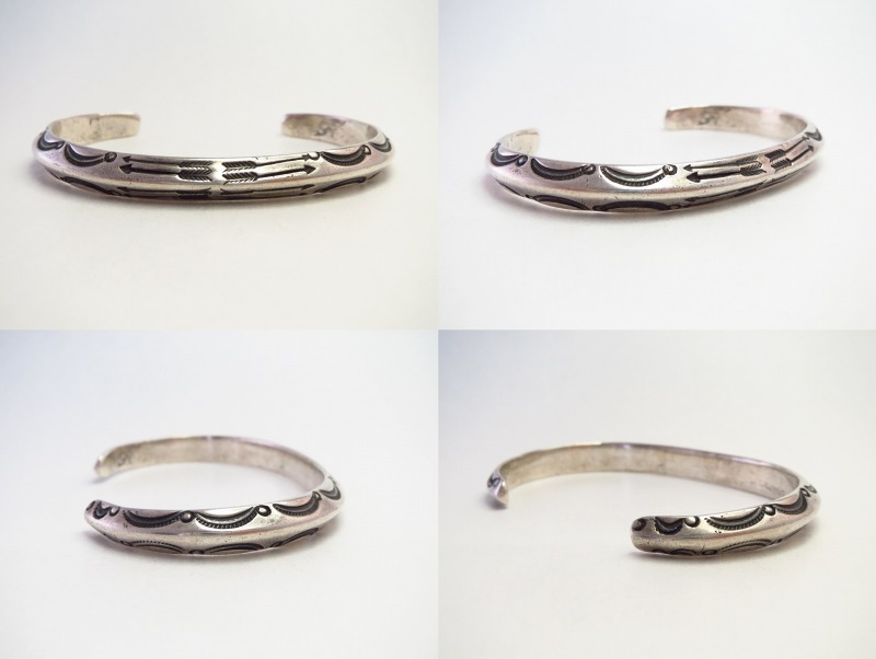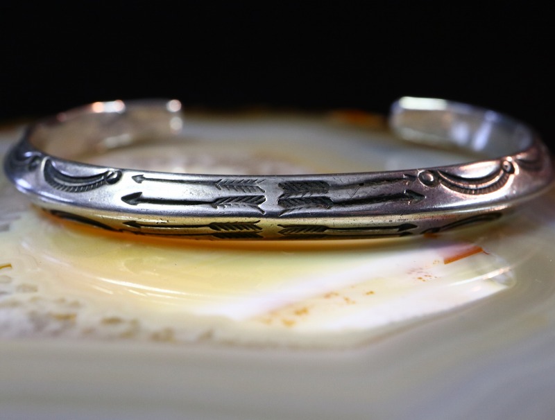 【NAVAJO】ナバホのアンティークジュエリー、インゴットシルバー(銀塊)から成形された硬く重厚なトライアングルワイヤー(竜骨型)をベースに、インディアンジュエリーにおける最古のモチーフの一つであるアローのスタンプワークが刻まれた作品。古典期と呼ばれる年代に近い時代に制作された非常に貴重なアンティーク/ビンテージバングルです。