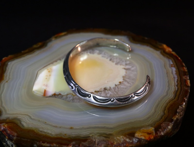 プリミティブな製法と、古典期から続く伝統を継承する造形スタイルの作品であり、その製法や力強いスタンプワーク等によって、ビンテージインディアンジュエリーらしい武骨な雰囲気と、現代的においても洗練された印象も与え、練り上げられたアンティーク工芸品としての佇まいや独特の迫力を宿しています。