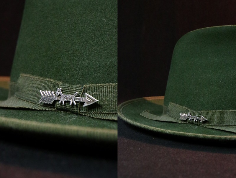 小さなサイズ感やビンテージアイテムと大変相性の良いアローシェイプ等、ピンとしてとてもスタイリングしやすく、多くのスタイルにフィットさせることが出来る汎用性を持っています。アウターのアクセントととして、ラペルや襟等にもフィットしますし、ハット等のワンポイントにも良いアクセントになってくれると思います。