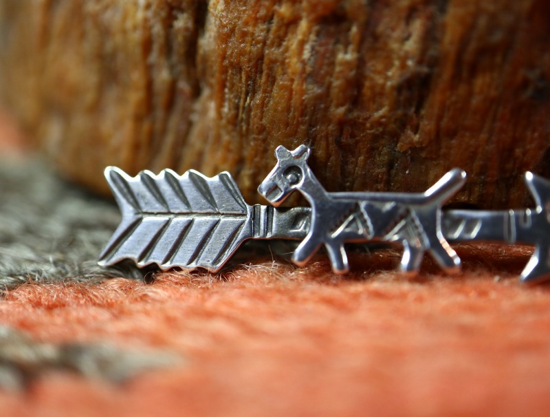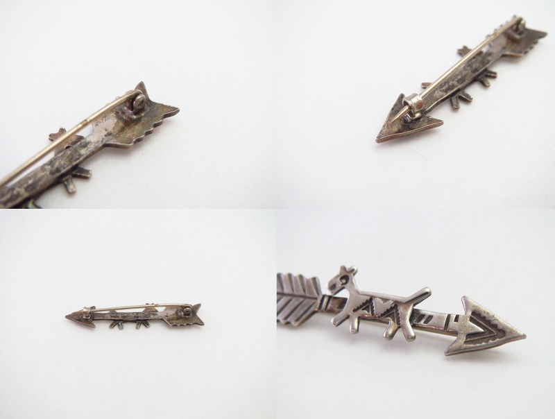 1930年代中頃~1940年代製と思われ、ツーリストジュエリーやフレッド・ハービースタイルを代表するようなアローモチーフがベースとなっており、そこに小さなホースがアップリケ/パッチワークされています。さらに、細かなスタンプワークによって細部が描き出されており、ナバホらしい味わいがもたらされているようです。また、当時の記録によればこちらのピンもコインシルバー900で作られています。一部の工程には機械が用いられているため、マシン&ハンドメイドのハイブリッドなピースであり、ある程度量産されたピースですが現在では現存数の少ない貴重な物となっています。