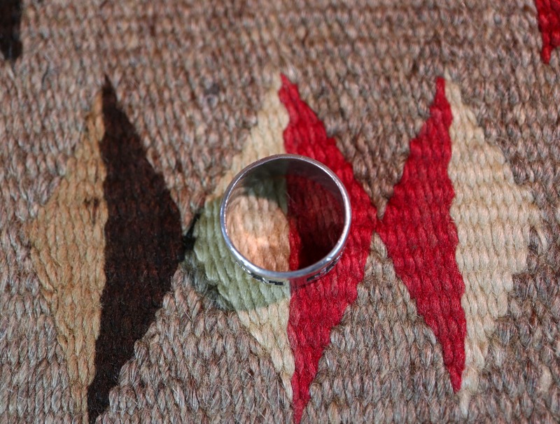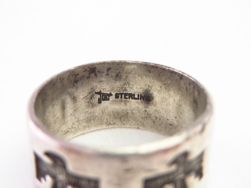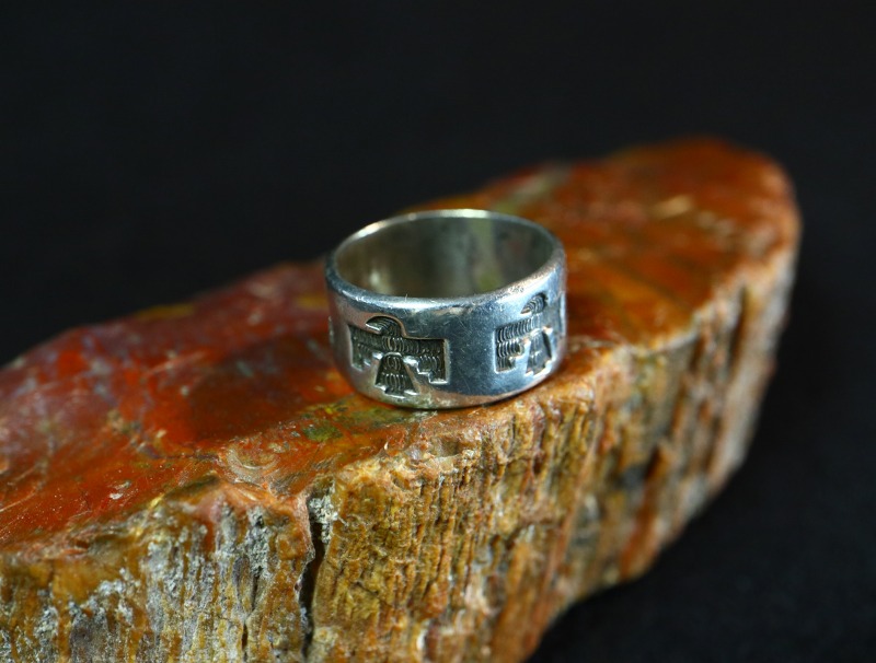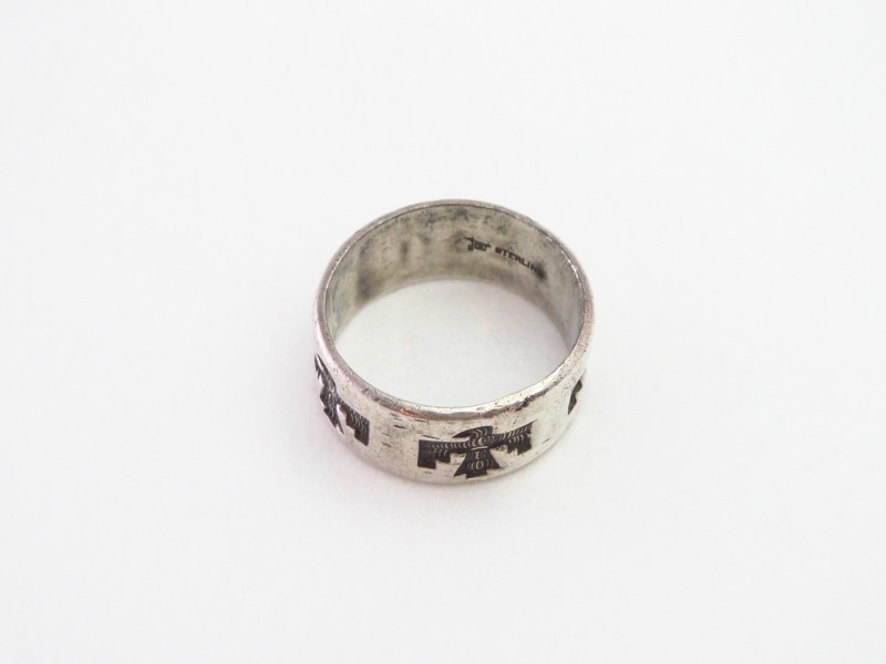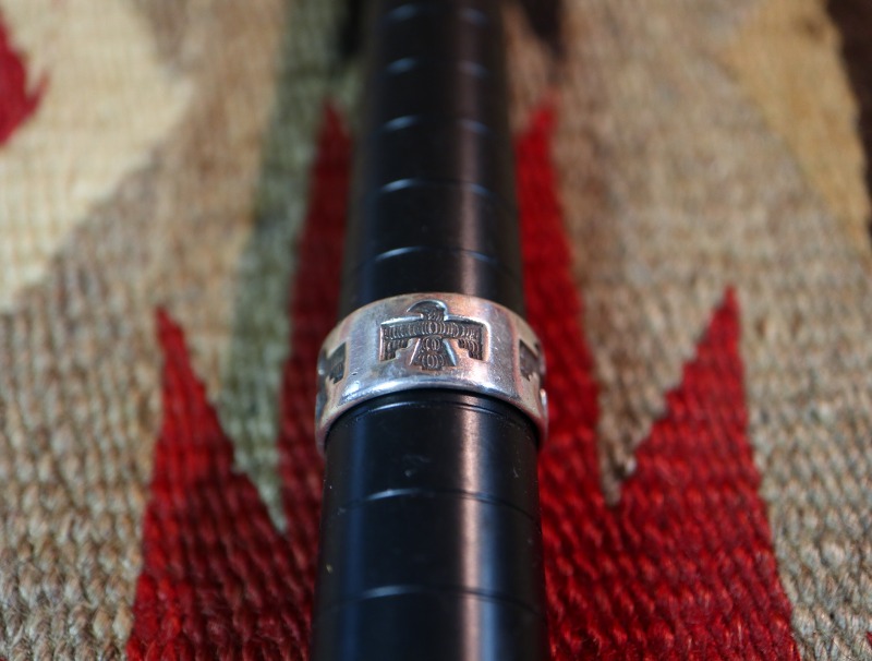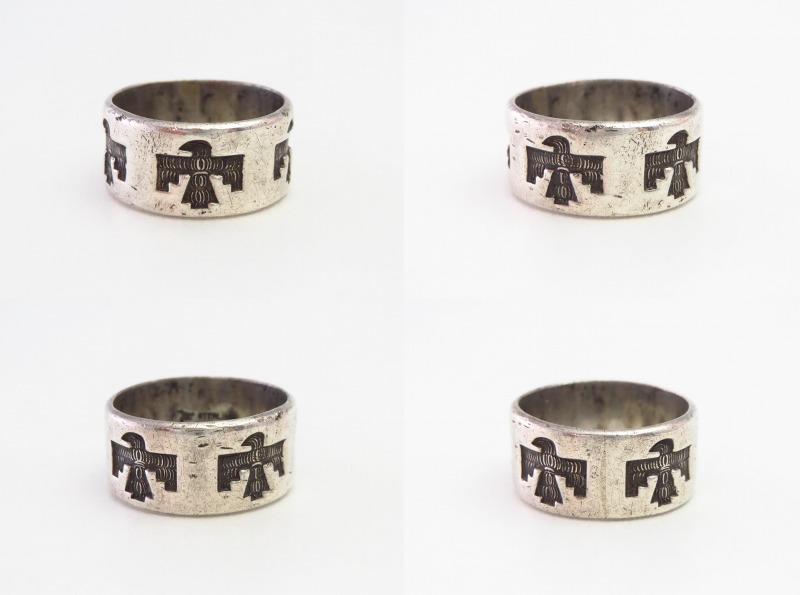 とても程よいボリューム感のリングで、このようなワイドウィズで円周全てが形作られたリングは「バンドリング」とも呼ばれ、インディアンジュエリーに限らず、リングにおいてオーセンティックな造形スタイルの一つとなっています。そのようなシャンクをべースにサンダーバードが連続で施され、シンプルながら大変センスの良いピース。サンダーバードには細かなテクスチャーも刻まれ、インディアンジュエリーらしい奥行きがもたらされています。また、シンプルでオーセンティックなデザインは現代的な印象も持っていますが、シルバーの肌や武骨な質感などはビンテージ独特の味わいが感じられます。制作工程には機械が用いられているため、マシン&ハンドメイドのハイブリッドなピースであり、ある程度量産されたリングですが現在では希少な物となっています