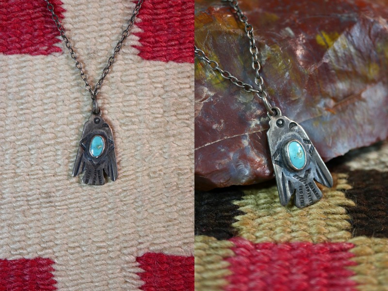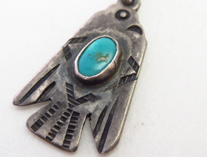 【NAVAJO】ナバホのアンティークジュエリー、とても小さなサンダーバードシェイプをベースに、綺麗なターコイズがマウントされ、スタンプワークによってサンダーバードの細部が描き出されたトップのアンティーク/ビンテージネックレスです。