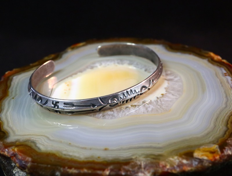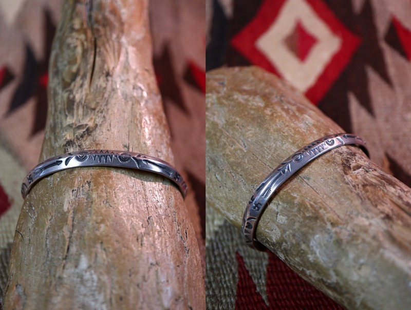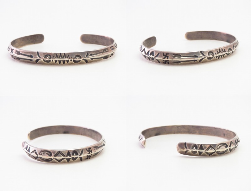 さらに、上下対称に逆卍やアロー等のスタンプワークが施されており、ターミナル(バングルの端)のエッジは丸く鞣されています。これらの製法や造形スタイルからは、ツーリストジュエリーの中でも古い作品と推測する事が出来ます。また、初期のツーリストジュエリーである為、具体的なモチーフがアロー以外には見られず、スタンプ(鏨)は抽象的なモチーフとなっていますが、連続して構成されることでプリミティブな中に、どこか洗練された印象も感じさせます。