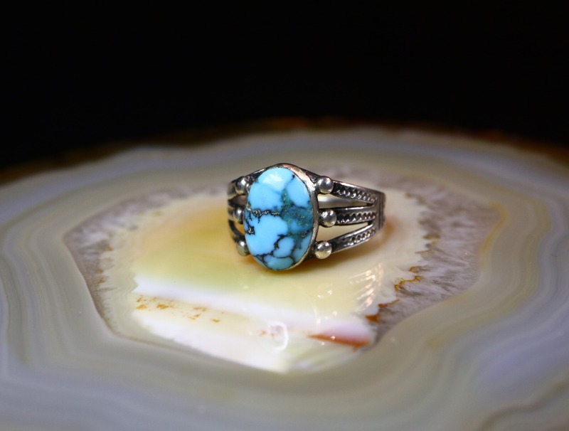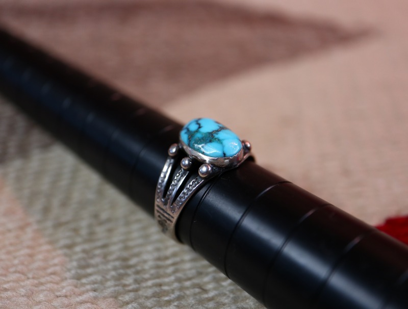 ツーリストジュエリーながら伝統的な技術によって形作られたナバホジュエリーの強さと、経年による独特の迫力を持ち、ビンテージインディアンジュエリーの魅力の詰まったアンティークリングです。