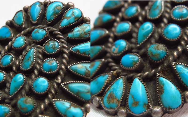 ターコイズの間にはツイステッドワイヤーが施され、エッジには細かなシルバードロップが配されており、とても古いピースながら精巧な作りが見られます。
