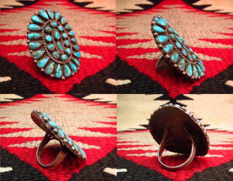 ズニ族の素晴らしいクラスターリング、1930年代後半~50年代製の大変古い作品で歴史的な史料価値も高いビンテージリングです。