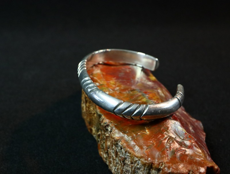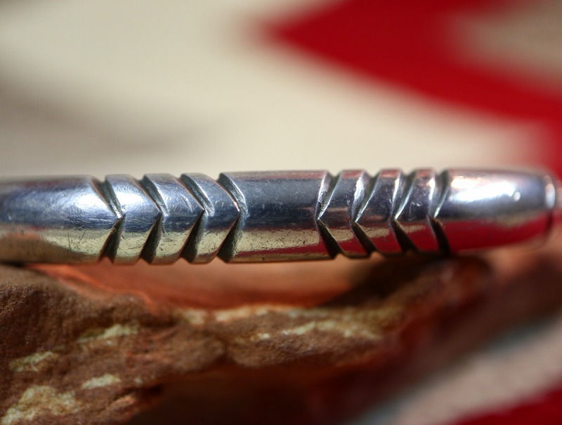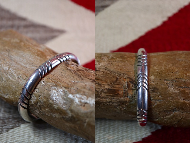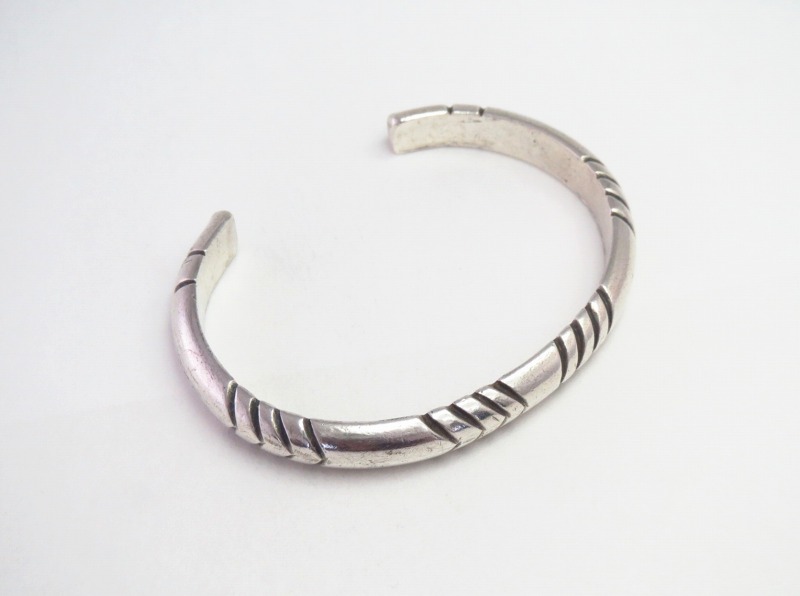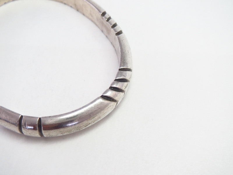 【NAVAJO】ナバホのビンテージジュエリー、細い幅ながらずっしりとした重みのあるハーフラウンドワイヤーをバンド(地金)に構成し、刻みによるプリミティブな文様のみで装飾されたミニマムな美しさを感じさせるアンティーク/ビンテージバングルです。