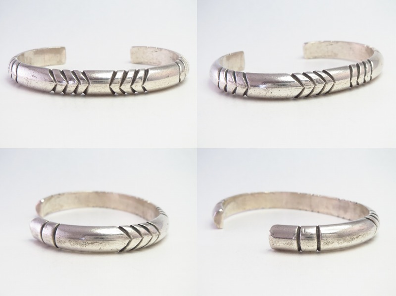 ホールマーク(作者のサイン)やスタンプワーク等、制作背景を特定する判断材料が乏しい為、正確に特定は特定できませんが、1940年代~1960年代頃に作られたと思われる作品。その造形スタイルや、このようなキャスト(鋳物)によってある程度成形されたインゴットを作り、それをローラーやハンマーワークで成形して、そこにライン模様だけでデザインを構成した作品は、アリゾナ州のニューメキシコ州境に近い位置で運営されていた【Pine Springs Trading Post】パインスプリングストレーディングポストで多く制作されていた記録が残っています。またそれらは、ナバホの【Ambrose Roanhorse】アンブローズ・ローアンホース(1904-1982)が中心になって運営されていた『U.S.NAVAJO』【Indian Arts & Crafts Board】(IACB)や『Navajo Guild』【The Navajo Arts & Crafts Guild】(NACG)等と関係するプロジェクトの影響を受けた作品群であったようです。