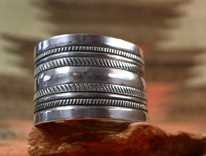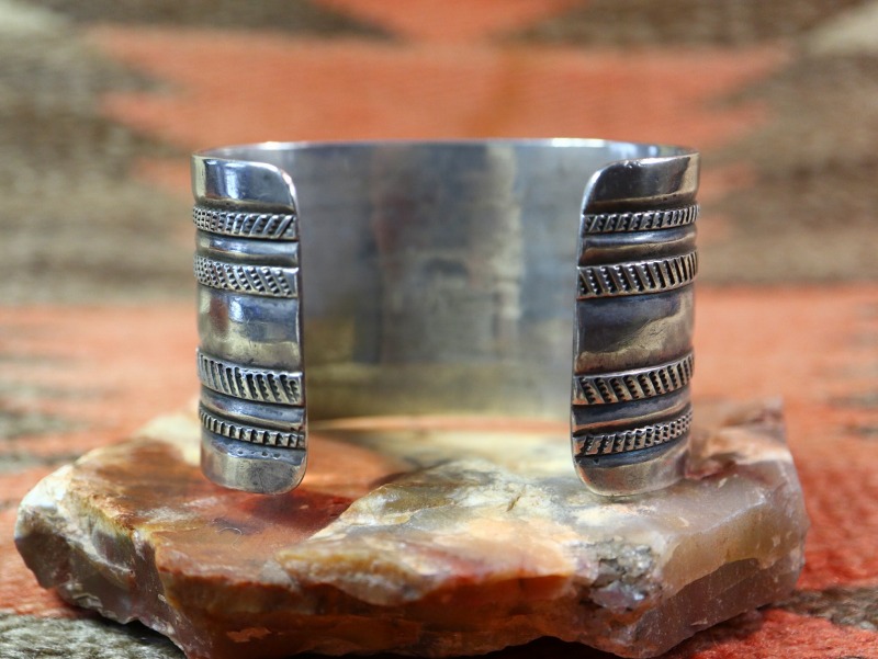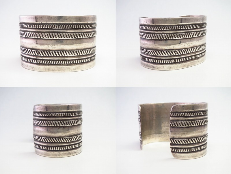 【NAVAJO】ナバホのアンティークジュエリー、インゴットシルバー(銀塊)から成形されたバンド(地金)をベースに、プリミティブながら確かな技術を感じさせるチェイシングやファイルワーク、スタンプワークによって形作られたワイドなアンティーク/ビンテージバングルです。