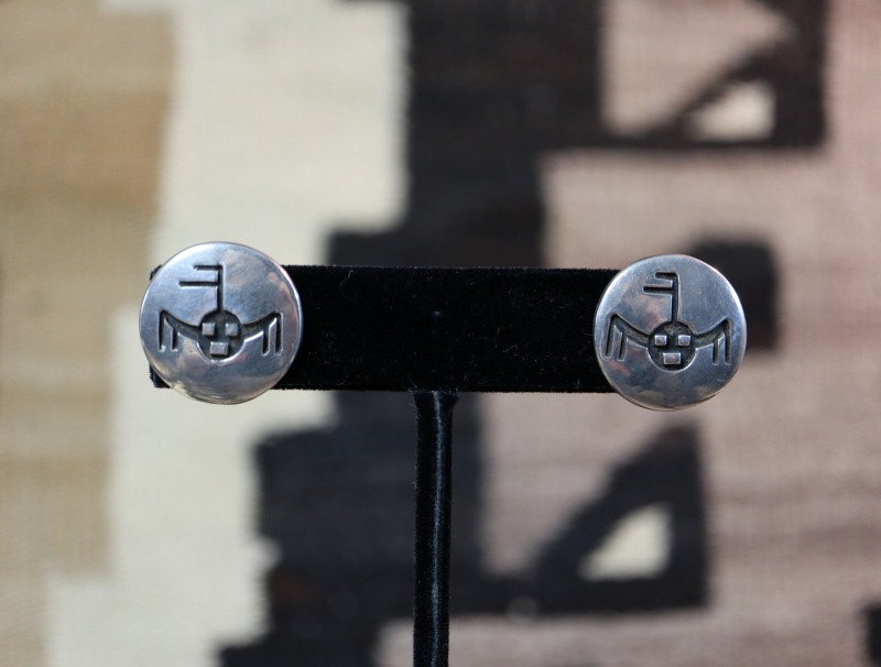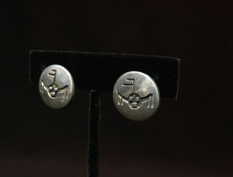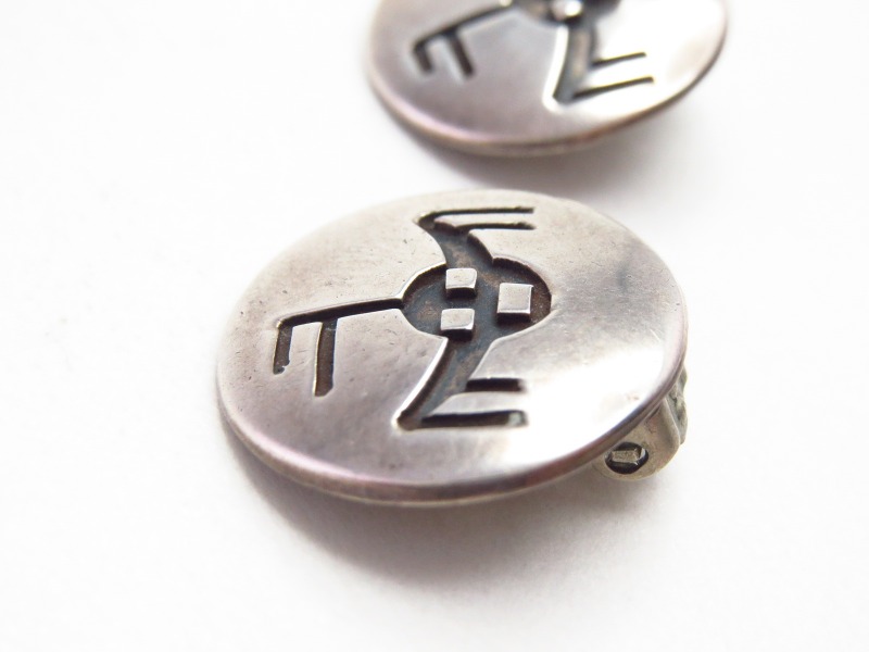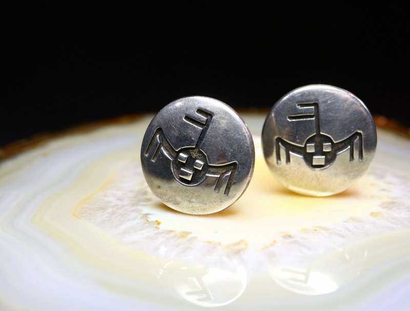 現代ではホピジュエリーの代表的な彫金技法として知られている『オーバーレイ』によって構成された作品ですが、本作の制作された年代にはナバホの作家も多くのオーバーレイ技法を用いた作品を残しており、本作もそのモチーフからナバホのシルバースミスによって制作されたイヤリングと推測されます。