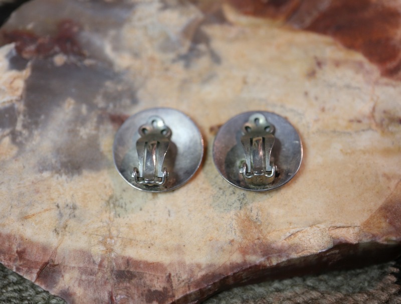 【NAVAJO】ナバホのビンテージジュエリー、シンプルなラウンドシェイプをベースにオーバーレイによって構成された『角の生えた月/ホーンドムーン』をモチーフの作品。シンプルながら愛らしいデザインで、クリップタイプのアンティーク/ビンテージイヤリングです。