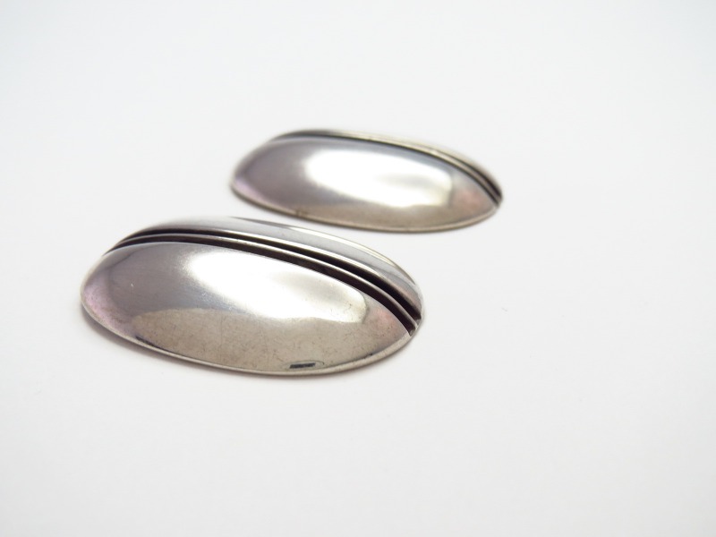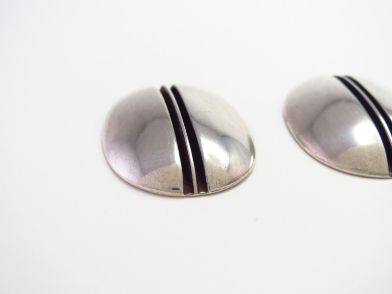 ピアスという古い年代には見られないアイテムであることや、ホールマーク(作者のサイン)等から、1960年代後半~1970年代に作られたと思われる作品。フラットな土台をベースに、『Hollow Style』ホロウ スタイルと呼ばれる中空構造のに近いドーム型のシェイプが形作られています。そのセンターにライン状の凹が作られ、その中央にはプレートの断面が構成されており、シンプルながら非常に高い技術と洗練されたシルバーワークによって作り上げられており、構築的で無機質な質感の中に、奥行きや品のある豊かな表情が感じとれる作品となっています。