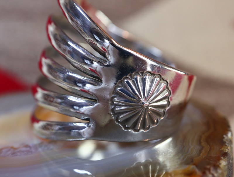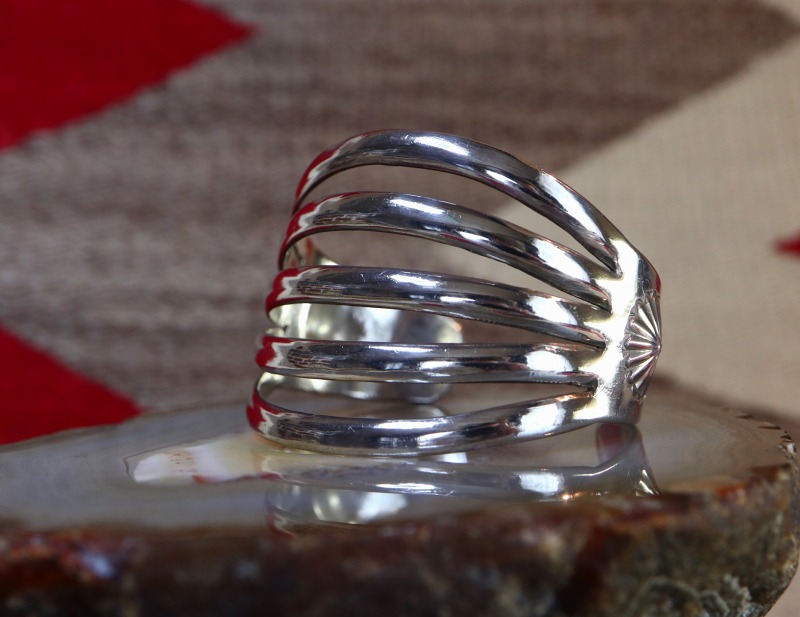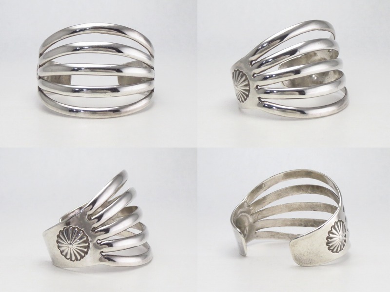 後年に作られた同デザインの多くは、上記のような過去の名作を元にキャスト(鋳物)で成形されたピースが多く見られますが、もちろんこちらの作品では伝統的なスプリットの技術が用いられており、おそらくインゴットシルバー(銀塊)から成形されたバンド/地金をベースに、ワイドなバンドを割り開くことで流麗なスプリットバンド/シャンクを形成しています。また、その製法と丁寧な仕事により、なめらかなシルバーの肌を実現しており、それらを5本に割り開くことで流麗なスプリットバンドを形成しています。さらに、ハンマーワークとヤスリでのファイルワーク(削り)によりそれぞれのラインにきれいなアール/曲面がもたらされており、サイド~ターミナルにはフラワーコンチョのような美しいスタンプワークが施され、その中心部分は、リポウズと云う内側からたたき出す技法によって立体的な膨らみがつけられています。