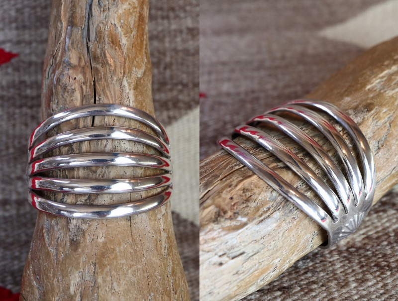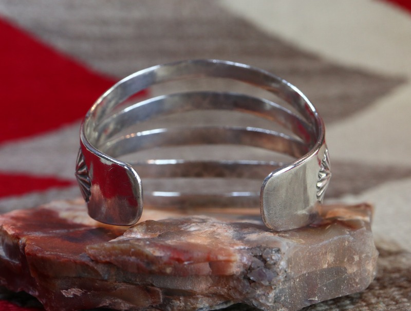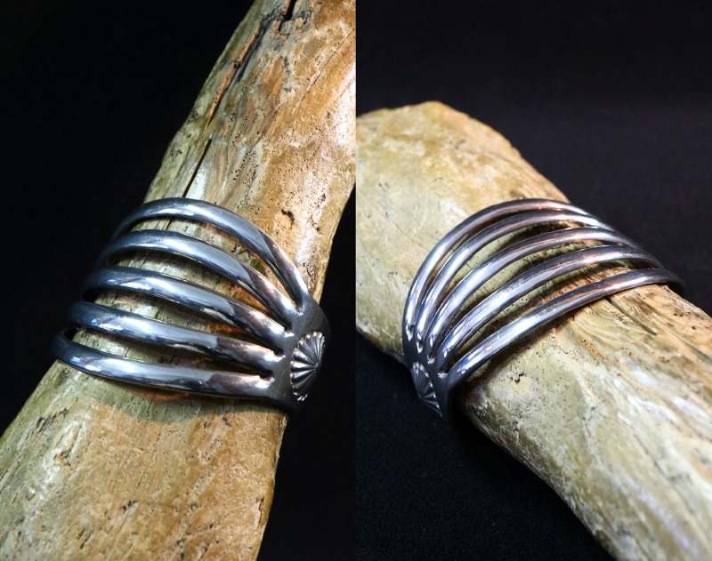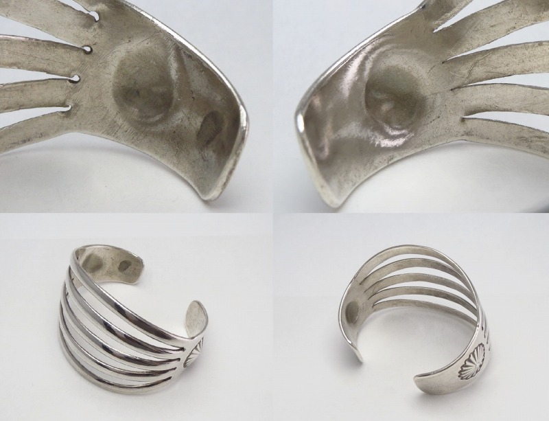 1940年代~1960年代に作られたと思われる作品で、こちらのようなシルバーを割り開くことで造形するスプリットバンドによって作り上げられる美しいデザイン/造形は、インディアンジュエリーの古典期に生まれた造形の一つです。その後、1930年代には【Fred Peshlakai】フレッド・ぺシュラカイ(1896-1974)も同様の作品を制作しており、ナバホの伝統的スタイルとして受け継がれた造形スタイルとなっています。