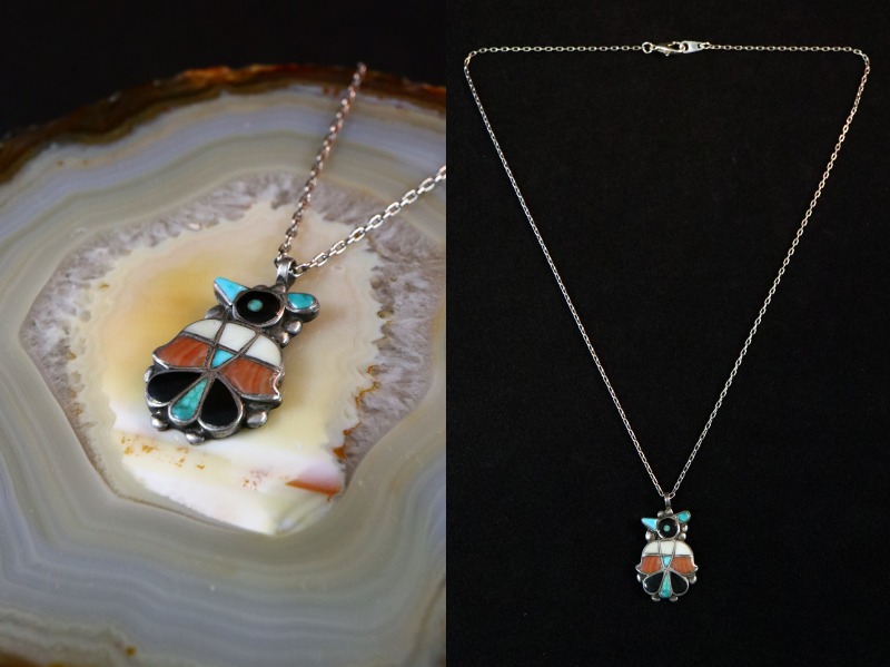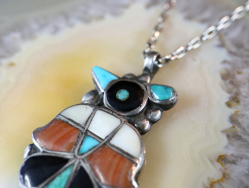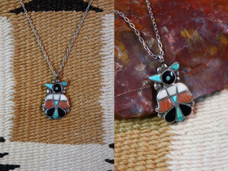 【ZUNI】ズ二のビンテージジュエリー、サンダーバード/ホピバードのモチーフがチャンネルインレイで造形された作品。ズニらしい多彩な素材をインレイすることで生み出される美しい色彩と柔らかな曲線で構成された可愛い印象が特徴的なトップのアンティーク/ビンテージネックレスです。