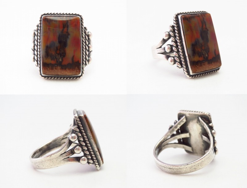1940年代末頃~1950年代前後に制作された作品と思われ、おそらくインゴットシルバー(銀塊)から成形されたシャンクは、丁寧なシルバーワークによってサイドからフロントに向かって3本に割り開かれた『スプリットシャンク』と呼ばれるナバホの伝統的なスタイルに造形されることで、フェイスに向けての自然な流れを作り出しています。フェイスはスクエアカットによって男性的な印象を持つペトリファイドウッドによって構成され、そのベゼル(覆輪)には、2本のシルバーワイヤーを撚り合わせたツイステッドワイヤーが施されています。さらに、シャンクとの繋ぎ目にも太さの異なるツイステッドワイヤーとレインドロップとも呼ばれるシルバーボールが配され、ナバホジュエリーの伝統的なディテールで構成されていますが、センスが良くモダンな造形美を備えたリングとなっています。