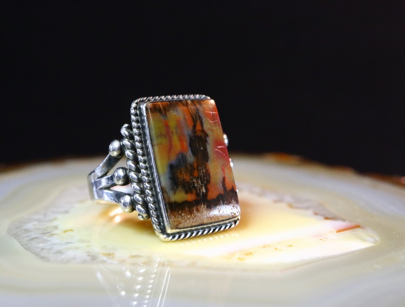こちらの作品にセットされたペトリファイドウッドもインディアン居留地に近い場所で産出したものと思われ、アリゾナ産らしいオレンジ×イエローオーカーをベースに、強く深いブラックが入り、一部には木であった名残りと感じられる表情が見られます。また、その様な色彩が複雑に入り混じった石が作り出す情景は、まるで夕焼けを背景にしたジョシュアツリーを見るようにも感じられます。