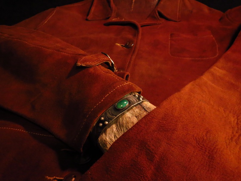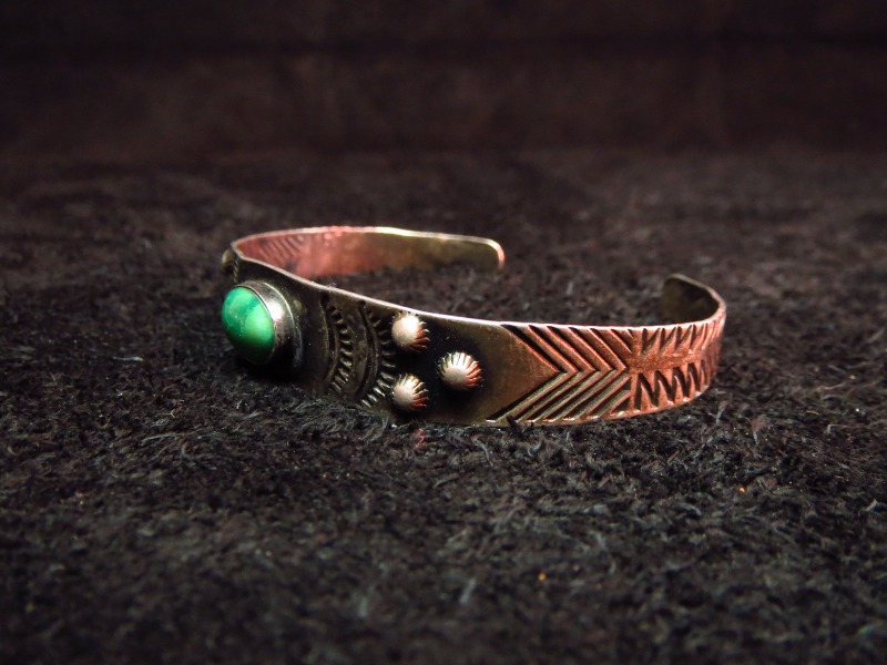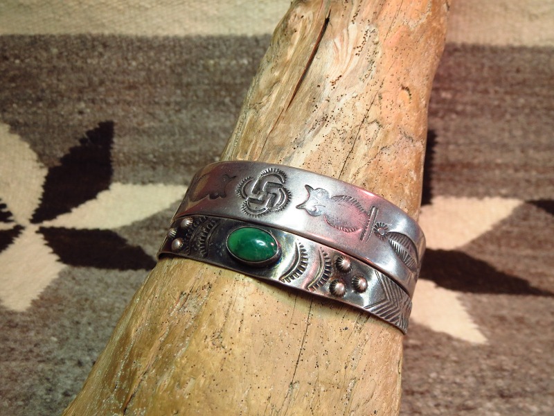 センターには美しいグリーンターコイズがセットされ、サイドには小さなコンチョのリポウズが施されています。 ほぼ全面に施されているスタンプワークはフレッド・ハービースタイルによく用いられる、具体的なモチーフのスタンプではなく、ナバホラグなどを想起させる紋様が刻まれています。