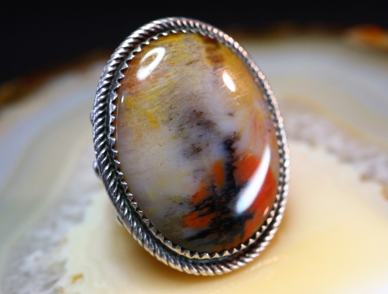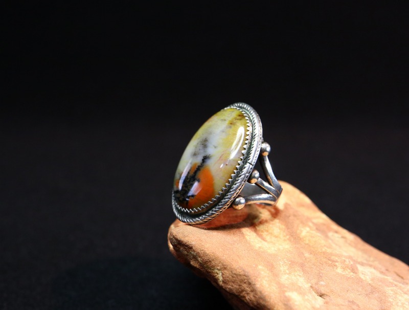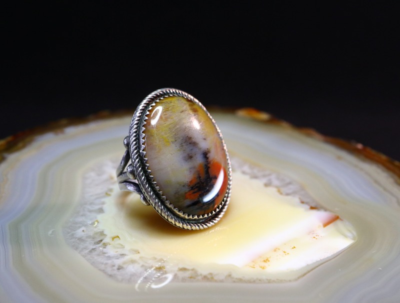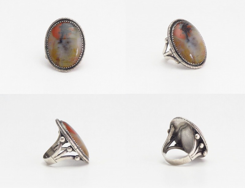 【NAVAJO】ナバホのアンティークジュエリー、オーセンティックなシルバーワークをベースに、グレーを基調に夕日の様なオレンジや柔らかなイエロー、そして強い黒も入るオーバルカットの【Petrified Wood】ペトリファイドウッド(木の化石)がマウントされたアンティーク/ビンテージリングです。