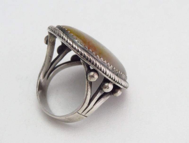 1940年代~1950年代頃に制作されたピースと思われ、『スプリットシャンク』と呼ばれる伝統的な造形で3本に割り開かれており、フェイスに向かって幅とボリューム感を持たせ、フェイスとの自然なつながりを作っています。そして、石のベゼル(覆輪)には、単独のスクエアワイヤーを捻ることで作り出すツイステッドワイヤーが施され、シャンクのとの間にはレインドロップとも呼ばれるシルバーボールが配され、ナバホジュエリーの伝統的でオーセンティックな造形スタイルを持ったリングとなっています。
