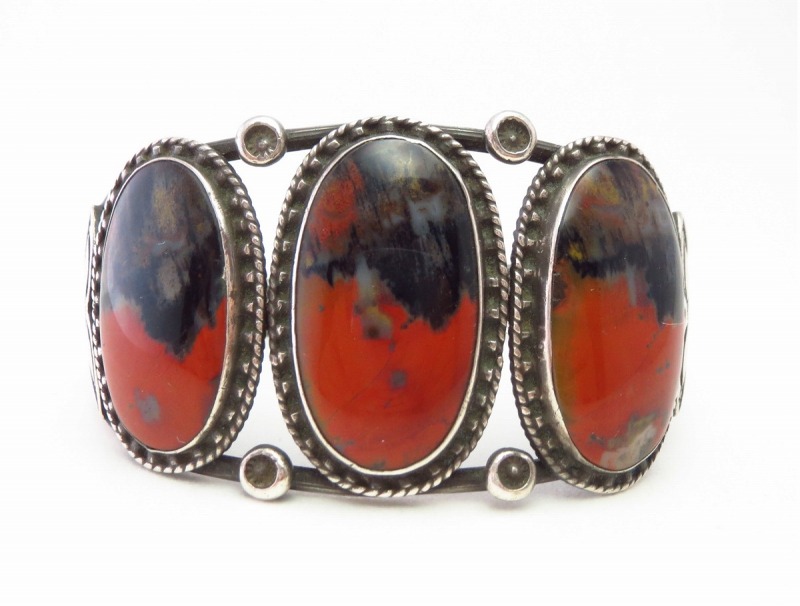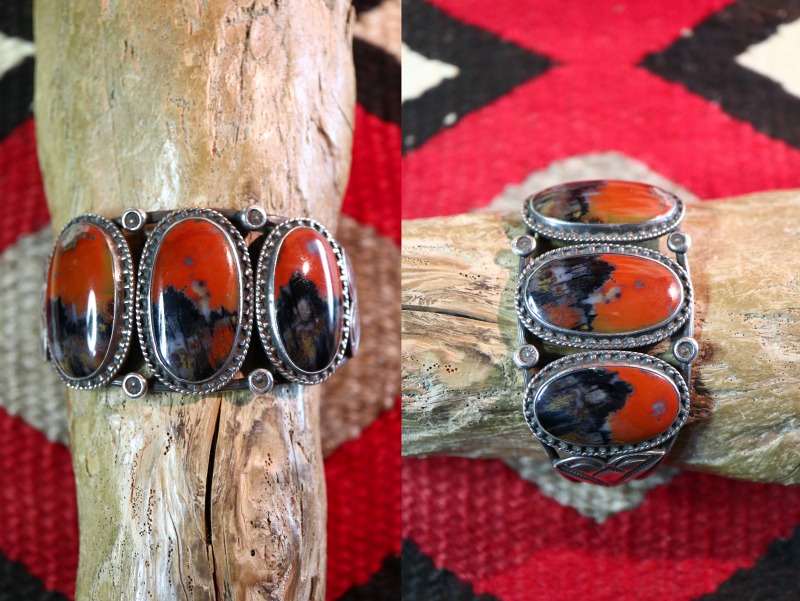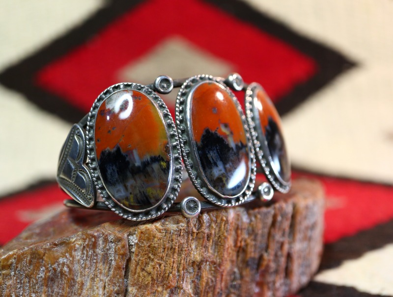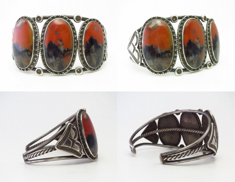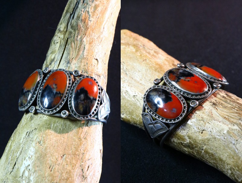 【NAVAJO】ナバホのアンティークジュエリー、バーミリオン(朱色)と複雑な景色を形成するブラック×ブラウンを基調とした美しい【Petrifiedwood】ペトリファイドウッド(木の化石)をメインに構成した作品で、それらを羅列した『Row Work/ローワーク』と呼ばれる伝統的なスタイルのアンティーク/ビンテージバングルです。