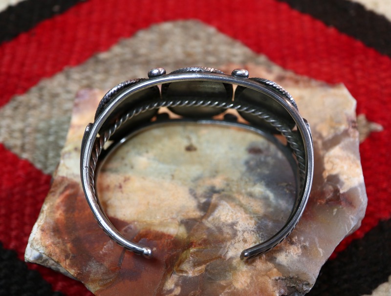1940年代~1950年代頃の作品と思われ、3連となったバンド/地金は2本のラウンドワイヤーと、単独のスクエアワイヤーを捻ることで作り出すツイステッドワイヤーによって構成されています。そこに、3つのペトリファイドウッドを連続してマウントすることでローワークデザインとなっています。そして、それぞれの石のベゼル(覆輪)にはジグザグのシルバーワークが配されることでターコイズの淵に影と奥行きを生み出しており、とても効果的で特徴的なディテールとなっています。このようなディテールは『Crimped Wire』クリンプトワイヤー(波型をつけたワイヤー)とも呼ばれ、その発祥は不明となっていますが、1930年代~1940年代からみられる造形スタイルの一つで、ナバホの偉大な作家【Fred Peshlakai】フレッド・ぺシュラカイ(1896-1974)も好んだディテールの一つです。また、その外側にはフラットなシェイプに成形されたツイステッドワイヤーが施されており、繊細で構築的な印象を持ったシルバーワークで構成され、奥行きのある表情に仕上げられています。さらに、両サイドには力強いスタンプワークの刻まれたアップリケが配され、石と石の間の4カ所には小さなコンチョが施されています。それら、本作を構成するディテールに派手な印象はありませんが、全て細かくも精巧であり、作者の非常に卓越した技術を感じさせます。