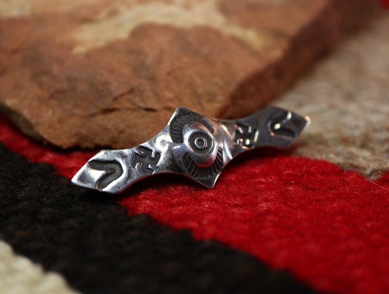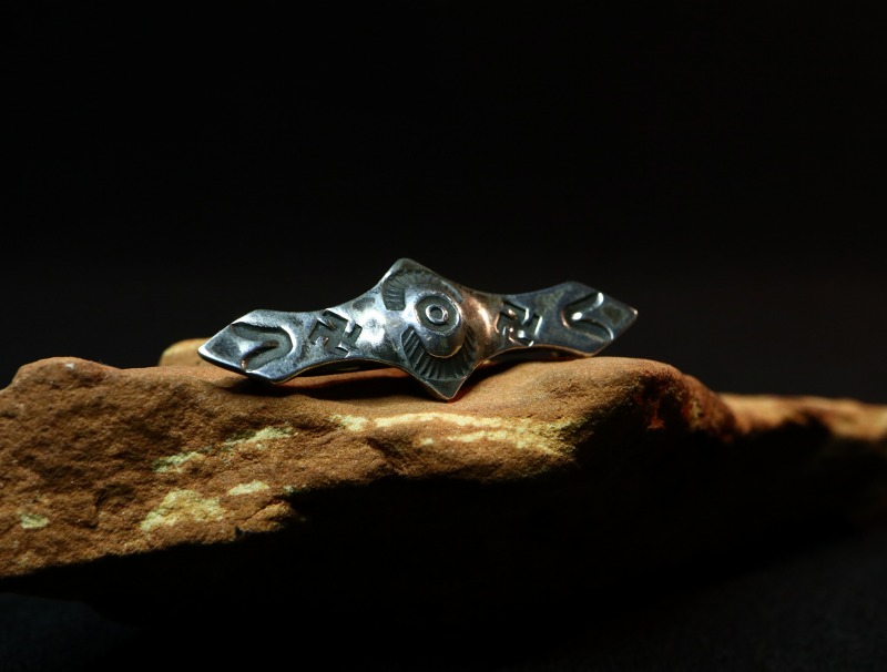 20世紀前半頃にアメリカ中西部の観光客向けに制作された【Tourist Jewelry】ツーリストジュエリーや【Fred Harvey Style】フレッド・ハービースタイルと呼ばれるスーベニアアイテム(土産物)の一つ。しかしながら全ての工程がハンドメイドによって仕上げられており、スタンプ(鏨)のデザインによって、当時サンタフェに在った【SOUTHWEST ARTS&CRAFTS】=【Ganscraft】で制作された物と判断できる作品です。