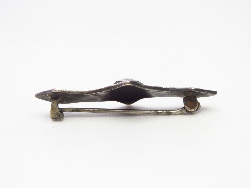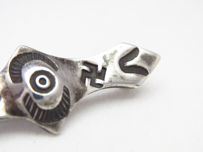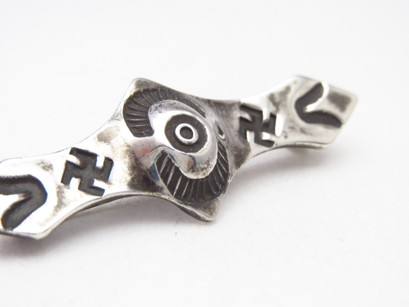 1920年代末頃~1930年代頃のピースと思われ、ツーリストジュエリーらしいモチーフのピースですが、インゴットコインシルバー(銀塊)から成形された地金をベースに造形された作品です。センターにはリポウズ/バンプアウト等と呼ばれるシルバーを叩き出す技術によって全体に丸く立体的な造形が作られていますが、現在多くみられる凸と凹の金型ツールを用いたディテールではなく、硬い木の土台や鉛の塊にアール(曲面)の溝を彫り込み、そこにシルバーを非常に細かく何度もタガネで叩き沿わせることによって曲面を作る古い技法によって形作られています。