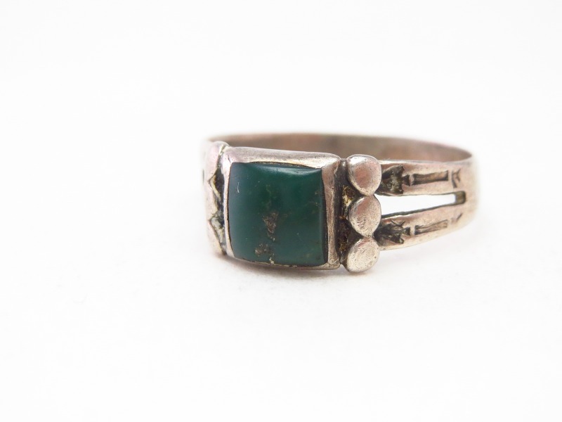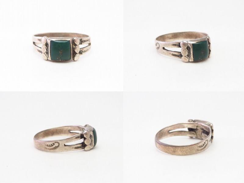 シャンクはフロントが割り開かれた『スプリットシャンク』と呼ばれる伝統的な造形で2本に割り開かれており、独特なアローモチーフのスタンプが刻まれています。そこにスクエアカットの小さなグリーンターコイズがマウントされ、その両サイドにレインドロップとも呼ばれるシルバーボールが配されることでナバホジュエリーらしい奥行きのあるリングに仕上げられています。さらに、使用によって鞣されたシルバーの表情は独特のなめらかで有機的な質感を生み、ターコイズとベゼルも一体化したようなエッジのないリングになっています。