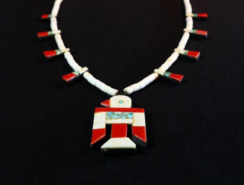 【Kewa】キワ/【Santo Domingo】サントドミンゴのアンティーク作品、比較的珍しいシェイプを持つサンダーバードが印象的なアンティーク/ビンテージネックレスです。 通称【Battery Bird】バッテリーバード、【Depression Necklaces】デプレッションネックレス/大恐慌のネックレスとも呼ばれる同部族の伝統的な作品の一つです。