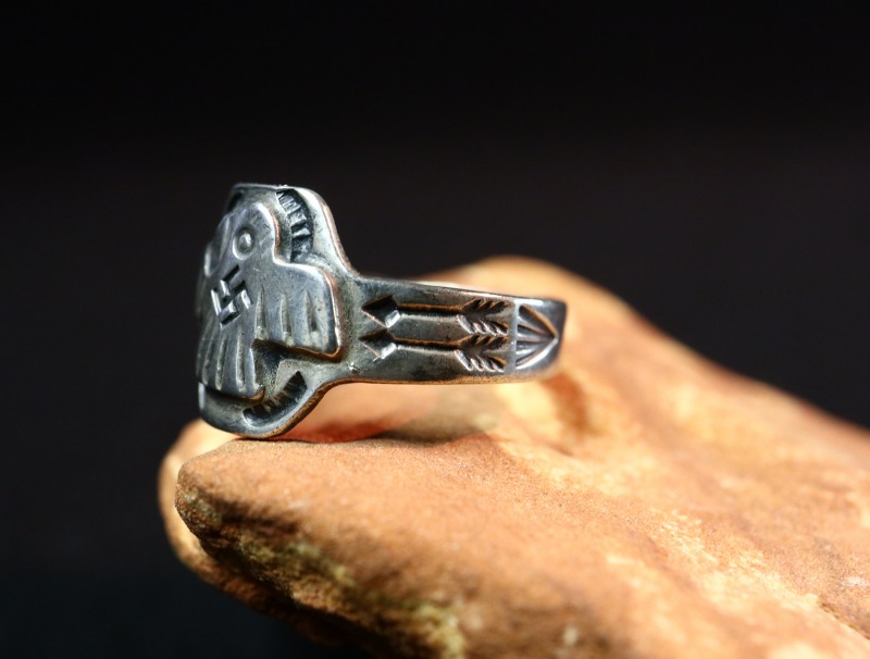 ツーリストジュエリーらしいキャッチーなアイテムながら、非常にバランスの良い秀逸なデザインとなっており、ナチュラルな指馴染みの良い雰囲気を持っています。可愛いサンダーバードモチーフも、そのアンティークの質感によって大人向けのアイテムに昇華されており、大きいサイズではありませんが、男性のピンキーにも向いたボリューム感となっています。