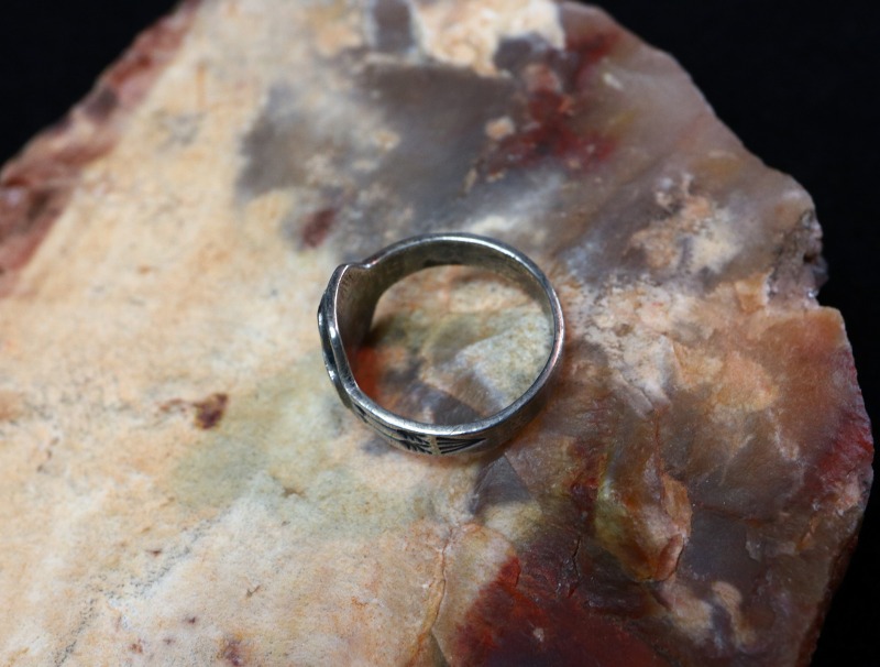 【NAVAJO】ナバホのアンティークジュエリー、控えめなボリューム感のシガーバンドシェイプをベースに、卍/Whirling Log/Nohokosのスタンプワークが刻まれたサンダーバードのアップリケ/パッチワークが施された貴重なアンティーク/ビンテージリングです。