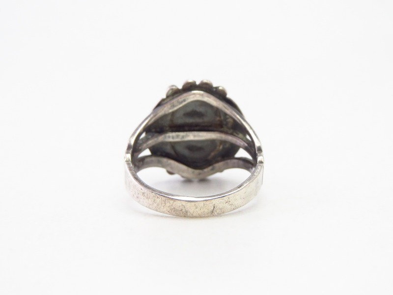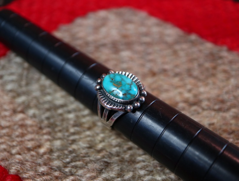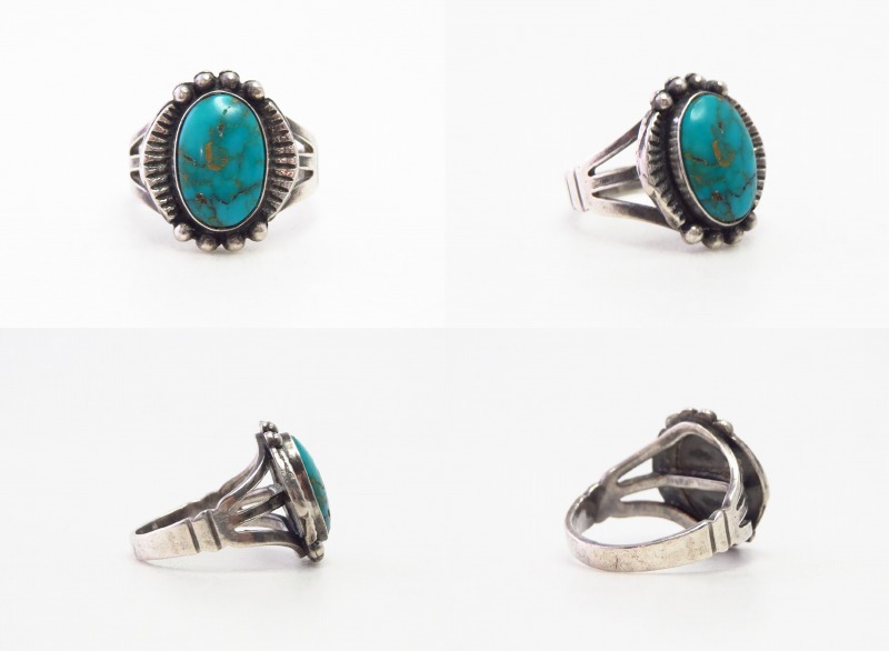 1940年代後半~1950年代頃に制作されたと思われ、【Tourist Jewelry】ツーリストジュエリーや【Fred Harvey Style】フレッド・ハービースタイルと呼ばれる20世紀前半頃にアメリカ中西部の観光客向けに制作されたスーベニアアイテム(土産物)の一つ。しかしながら質が高く美しいターコイズがマウントされ、クラシックなデザインも秀逸なとても完成度の高いリングとなっています。
