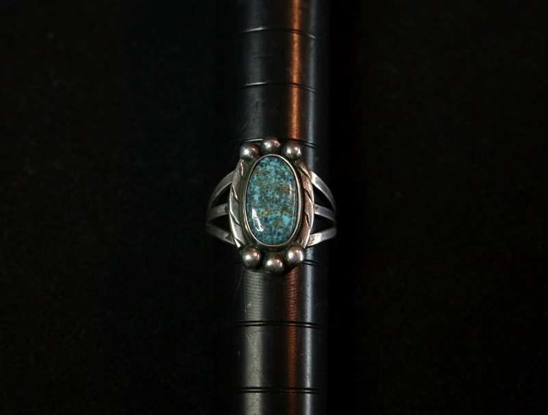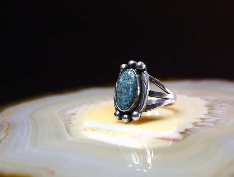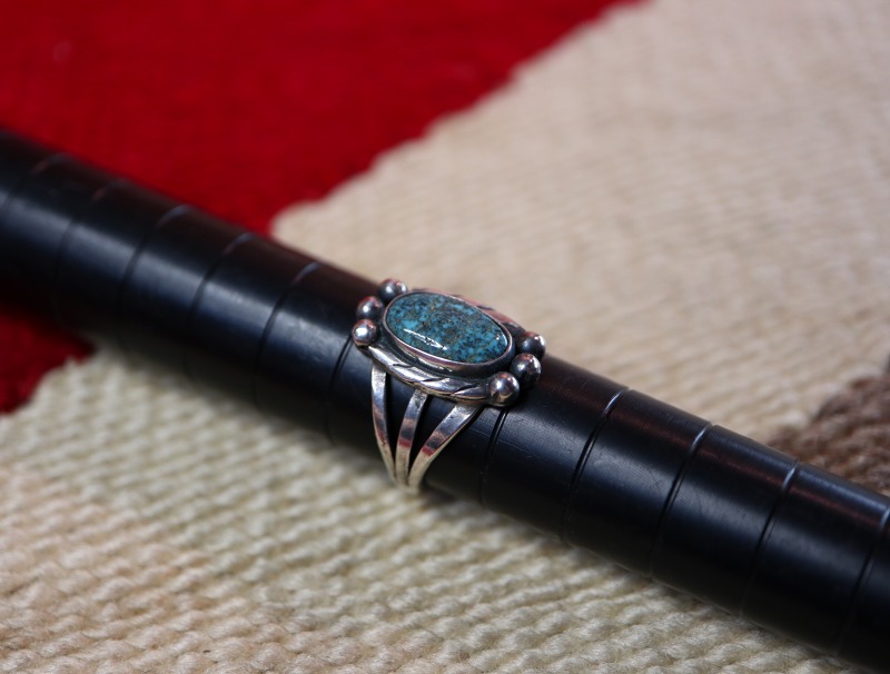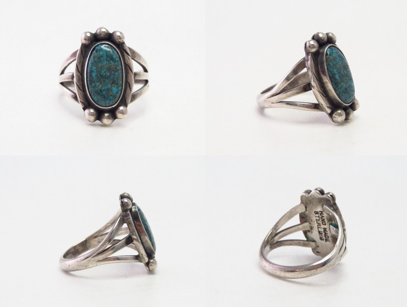 1950年代頃の作品と思われ、内側には『HAND MADE』の刻印が刻まれており、とても丁寧な仕事が感じられる作品。おそらくインゴットシルバー(銀塊)から成形されたシャンクは、フロントが『スプリットシャンク』と呼ばれる伝統的な造形で3本に割り開かれており、フェイスに向かって幅とボリューム感を持たせることでフェイスとの自然な繋がりを作っています。フェイスは美しいターコイズを中心に、ベゼル(覆輪)の両サイドには、2本のワイヤーを撚り合わせることで作るツイステッドワイヤーを、さらにハンマーワークによってフラットに成形したワイヤーが施されています。さらに、石の上下部分にはレインドロップとも呼ばれるシルバーボールが施されることで、さり気なくもナバホジュエリーらしい表情が与えられています。