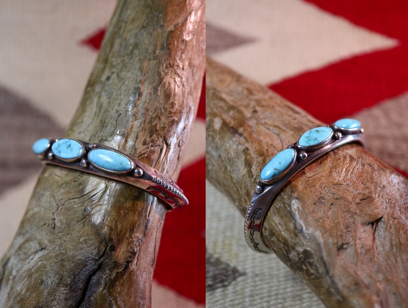 おそらくインゴットシルバー(銀塊)から成形された太く重厚なトライアングルワイヤーをバンドに構成し、フェイスとなる部分をハンマーワークによってフラットに仕上げています。そこに3つのオーバルカットターコイズが羅列され、それらの間には『レインドロップ』とも呼ばれる小さなシルバーボールが配されています。また、バンドのサイド~ターミナル(両端)には質の高いスタンプワークが刻まれており、特にエッジに刻まれたスタンプ(鏨)は、ライン模様を含んだスタンプをラインの方向に合わせ連続して刻むことで、シルバーの内側にライン模様を内包したような奥行きと立体感が生み出されています。現代でも【McKee Platero】マッキー・プラテロ氏等がこちらのようなスタンプの技術を受け継いでいますが、スタンプ(鏨)ツールをオリジナルで制作可能な腕の良いシルバースミスにのみ共通したクオリティと云えます。