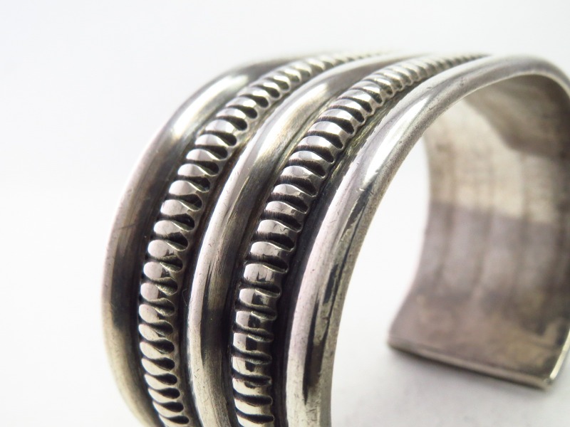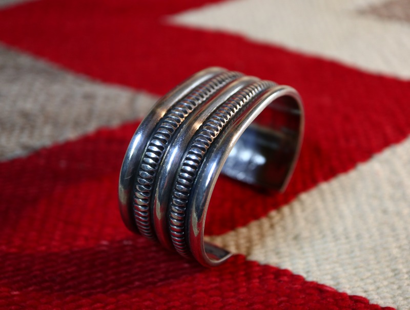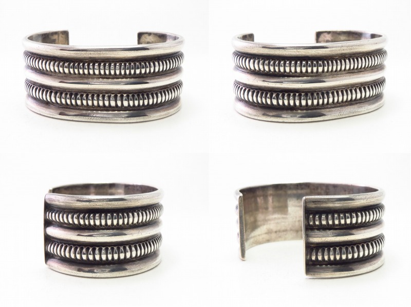 【NAVAJO】ナバホのアンティークジュエリー、インゴットシルバー(銀塊)から成形された非常に重厚な作品で、高い技術力を感じさせるチェイシングやスタンプワークで構成された作品。ホールマーク(作者のサイン)は刻印されていませんが、造形スタイルや細部のディテールから【The Navajo Arts & Crafts Guild】 (NACG)=通称『ナバホギルド』で制作された物と推定されるアンティーク/ビンテージバングルです。
