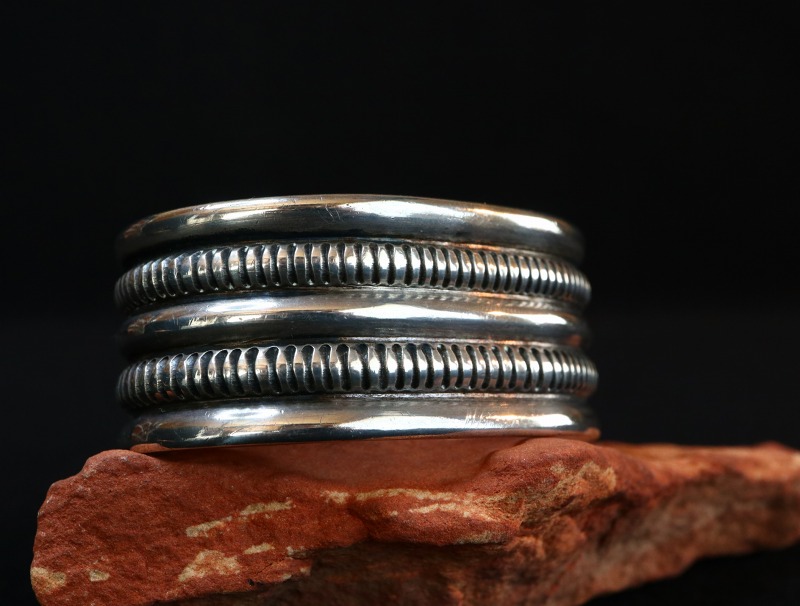 そして、それらのライン上には細かくも力強いスタンプワークが刻まれ、複雑な紋様ではありませんが、奥行きがあり非常に力強いナバホらしさとシンプルで洗練された印象を生み出しています。