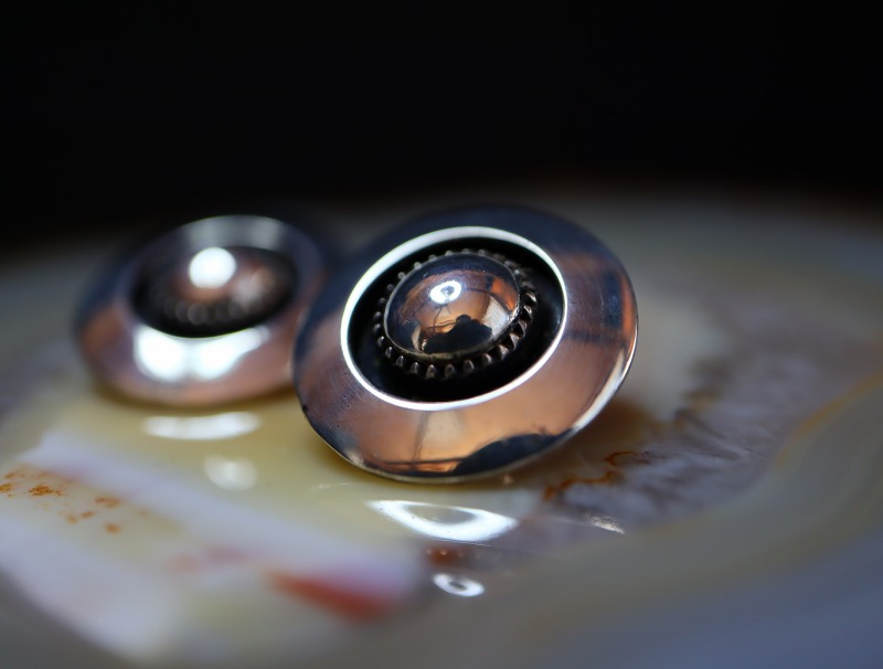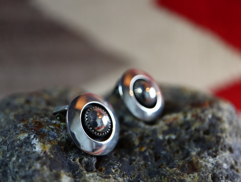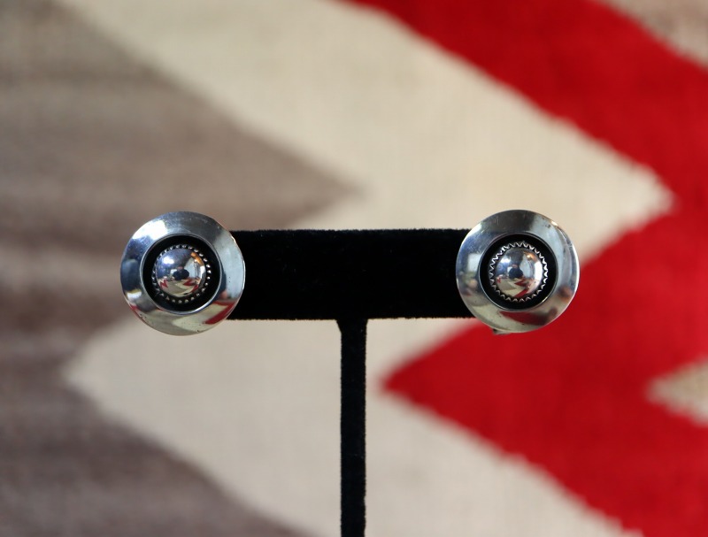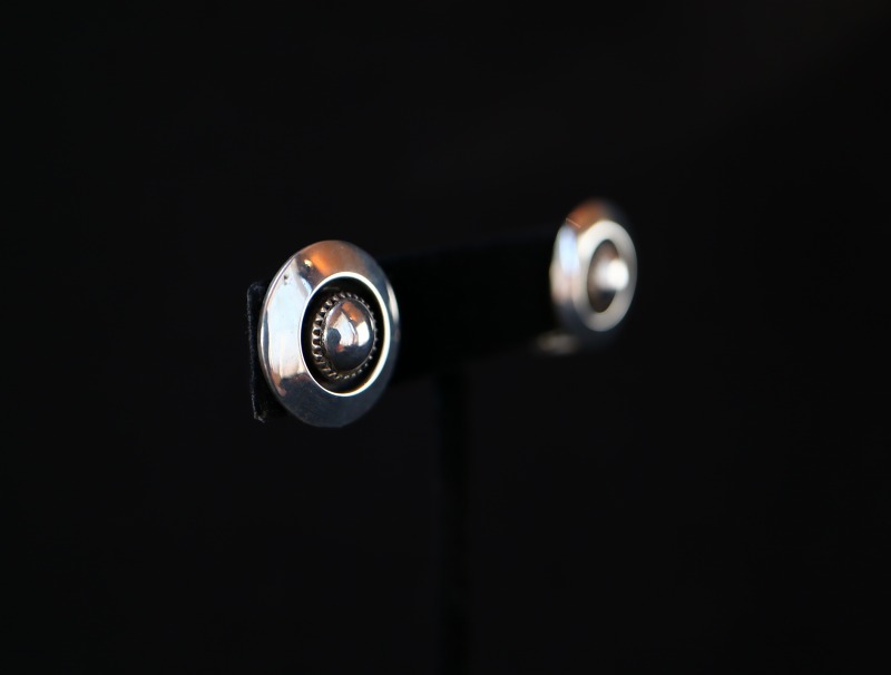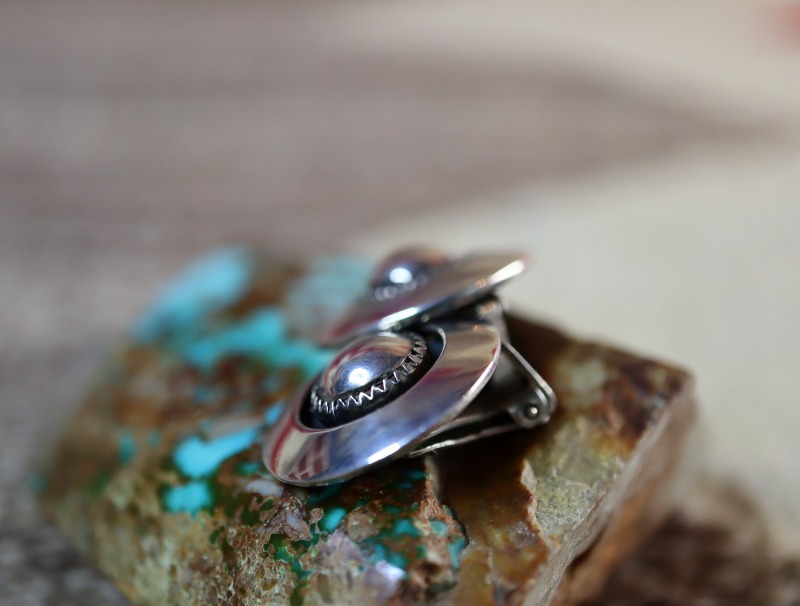 1940年代後半~1960年代頃に作られた作品と思われ、シンプルなラウンドシェイプをベースとしたイヤリング。フェイスには、コンチョのように半球型に近いシェイプに造形したナバホパール(真珠)やインディアンパールとも呼ばれるシルバービーズがマウントされており、ターコイズ等の石を留めるディテールと全く同じベゼル(覆輪)を用いてシルバービーズをセットしています。さらに、そのベゼルの周辺に影が作られており、シャドーボックスの造形となっています。また、そのシルバービーズからエッジに向けてイヤリング全体に柔らかなドームシェイプが作られており、上質感とソリッドなシルバーの美しさが際立った作品となっています。