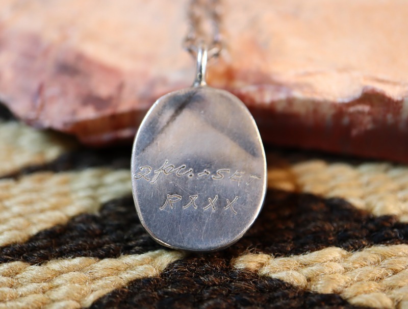ホールマーク(作者のサイン)やスタンプワーク等の正確な制作時期を特定する判断材料に乏しく、正確に特定するのは困難ですが、デザイン/造形スタイルやマウントされているターコイズ等からは、1940年代後半~1960年代頃にプエブロかナバホのシルバースミスによって作られた作品と推測されます。また、裏面に『2pc. SET』の文字が確認出来、元々はイヤリングやリング等他のアイテムとセットで制作されたものと考えられます。残念ながら当店では本作のみの入荷となっており、セットで作られた他アイテムはストックしていません。さらに、刻まれている『RXXX』の文字については制作された工房での管理番号や流通上、PawnShop等でプライスやアイテムコードとして使用された文字列と思われます。