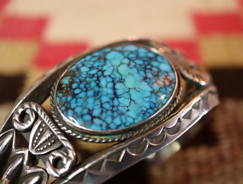 特別な質を持つジェムクオリティターコイズと、重厚で卓越した技術によるエスニシティなシルバーワークが織りなす造形美、そしてその迫力は、歴史を感じさせる奥行きを持っており、ジュエリーとしての品位とビンテージインディアンジュエリー特有のアーシーな雰囲気を併せ持っています。