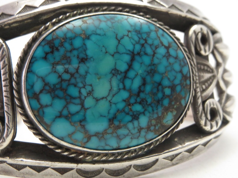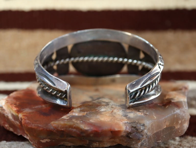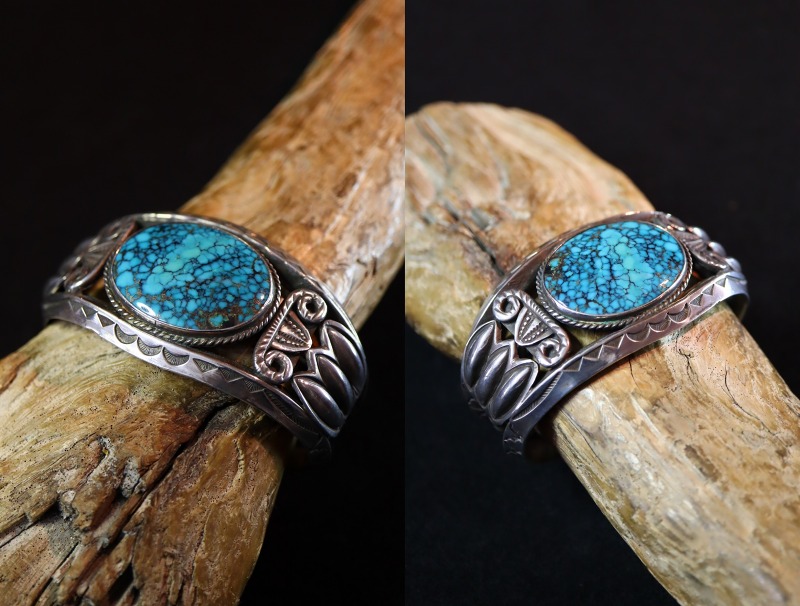 1930年代~1950年代中頃に作られたと思われる作品で、インゴットシルバー(銀塊)から成形された重厚なトライアングルワイヤー2本に挟まれるように大きくオーバルシェイプにカットされたターコイズがマウントされています。またそのベースとなっているバンドは、上下のトライアングルワイヤーだけでなく、中央に2本のワイヤーを捻ることで制作したツイステッドワイヤーが配されており、ずっしりと重いシルバーワークとなっています。さらに、トライアングルワイヤーにはとても力強く美しいスタンプワークが刻まれることでナバホジュエリーらしい複雑な表情や奥行きが与えられているようです。ターコイズのベゼル(覆輪)にも細いツイステッドワイヤーが配されており、石の両サイドにはワイヤーワークとスタンプワークを組み合わせたパーツがアップリケされています。さらに、両サイドにはリポウズ/バンプアウトによって立体的でワイルドなデザインのコンチョがアップリケされています。