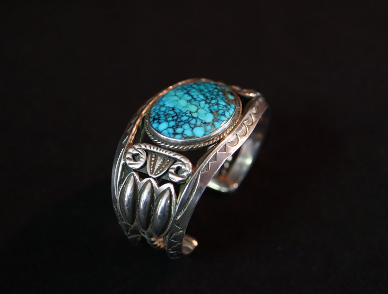 伝統的でプリミティブな彫金技術により、アンティークナバホジュエリーの武骨でワイルドな印象とクラシックでエレガントな美しさを兼ねそろえており、ビンテージスタイルにはもちろん、ドレスや少しフォーマルなスタイルにもフィットする汎用性を有し、多くのスタイリングにおいて特別な存在感を示すブレスレットです。