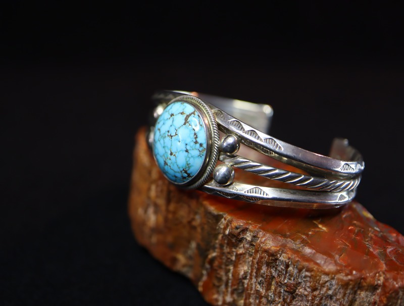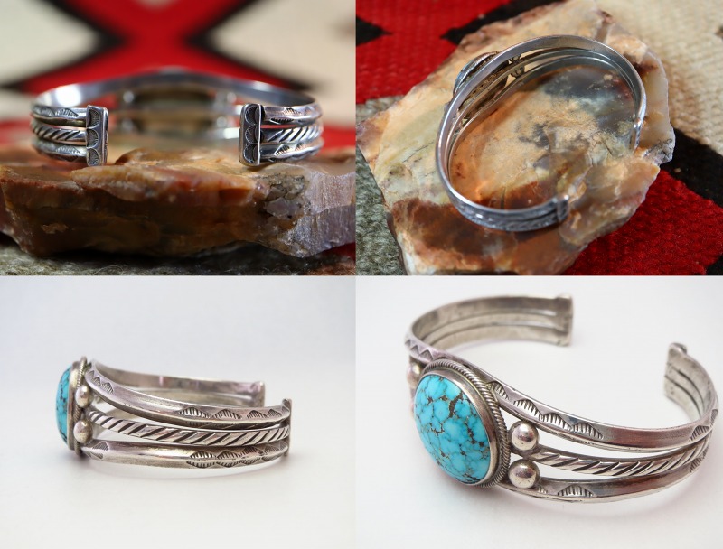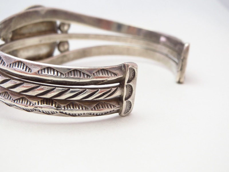 また、ターミナル(両端部分)にはワイヤー断面に小さなシルバーパーツが備えられることで、バンドを構成する3本のワイヤーがしっかりとまとめられており、そのタブパーツにも質が高く力強いスタンプワークが刻まれています。それら、細部まで非常に手の込んだ丁寧なシルバーワークによって形作られており、ナバホジュエリーの伝統的でオーセンティックなデザインの作品ですが、非常に高い完成度を持ち、力強くエッジ―で洗練された印象が与えられています。