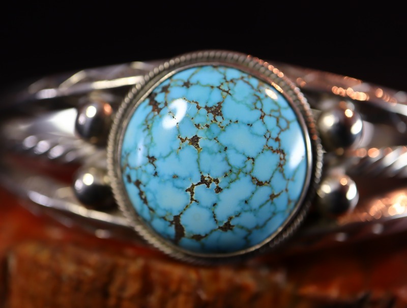 マウントされたターコイズは上質な【Old Number Eight Turquoise】オールドナンバーエイトターコイズです。 【Persian Turquoise】パージャンターコイズ/ペルシャンターコイズでも似た特徴の石が見られますが、本作にマウントされた石は1950年代に産出したナンバーエイトターコイズと思われます。美しいブラウンウェブを持つターコイズで、ハイドームにカットされたラウンドシェイプも素晴らしい迫力を生み出しています。ナンバーエイトらしいとても澄んだ水色のグラデーションを基調に、複雑な表情を作るブラウンウェブが入り、部分的にホワイト等のマトリックスも見られます。
