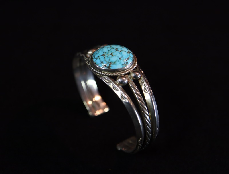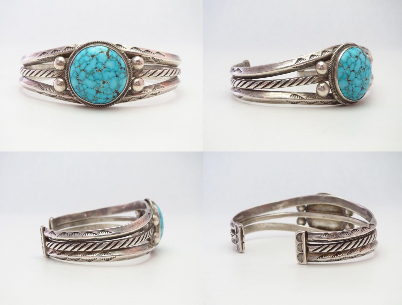 1950年代後半~1960年代頃に作られた作品で、2本のトライアングルワイヤーとナローなフラットワイヤーの合計3本のワイヤーを重ねることでバンドが構成されています。またそれらは、スプリットバンドの様にセンターが広くなるようにワイヤーの間を開き、その中央に美しいラウンドシェイプターコイズがマウントされています。また、その石を留めるベゼル(覆輪)には、単独のスクエアワイヤーを捻ることで作り出すツイステッドワイヤーが施され、両サイドにはレインドロップとも呼ばれるシルバーボールが2つずつ配されており、連続したつながりのある造形となっています。さらに、バンドを構成している上下のトライアングルワイヤーには、素朴な幾何学柄を刻むスタンプワークが刻印され、中央のフラットワイヤーにも規則的なバイアスライアンを刻むことで、ロープデザインやツイステッドワイヤーの様な表情が与えられています。
