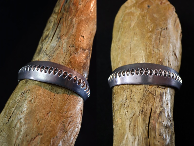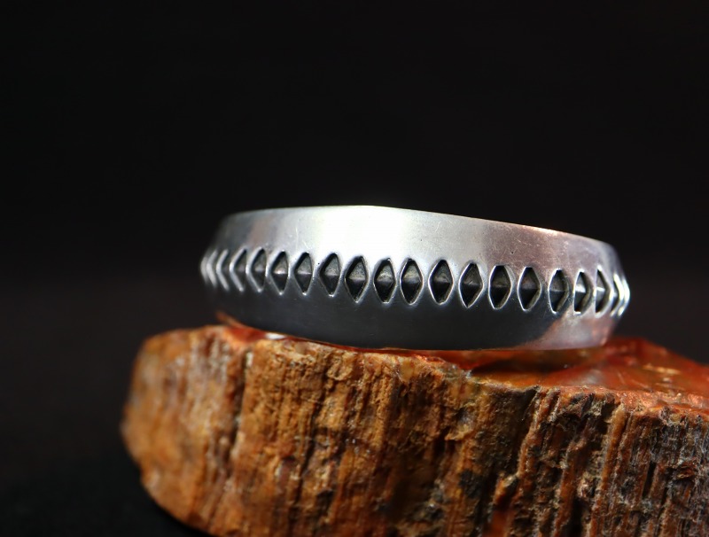 上記のようにオーセンティックなデザイン・造形をベースとしながらも手間を惜しまないシルバーワークによって形作られたバンドのシェイプや、作者の突出したセンスを感じさせるスタンプワークのディテールにより、シンプルながら繊細でナバホジュエリーらしい手仕事の温もりとエスニシティな魅力を放ちます。さらに、それに相反するエッジ―でアヴァンギャルドな表情も与えられており、あらゆる面で独創性を有するブレスレットとなっています。