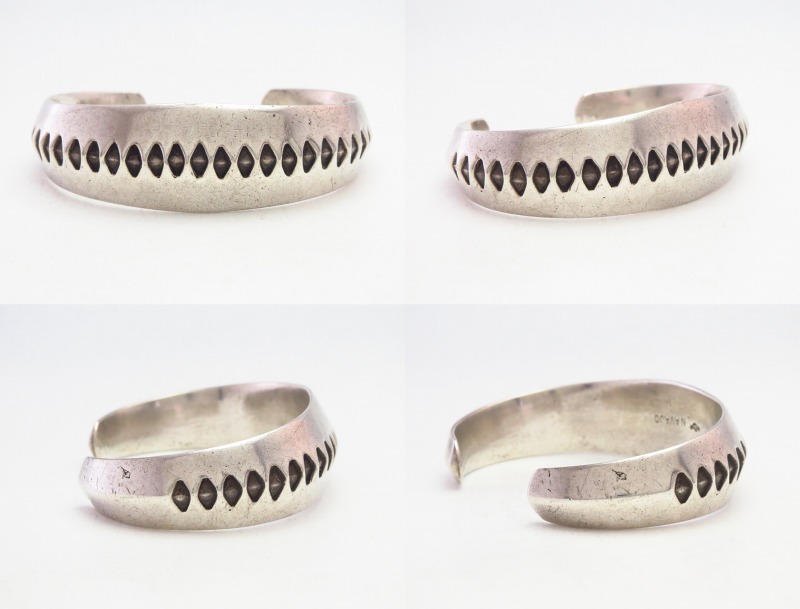 【NAVAJO】ナバホの中でも傑作を残している組織【The Navajo Arts & Crafts Guild】 (NACG)=通称『ナバホギルド』の作品。非常に重厚で太いトライアングルワイヤー(竜骨型)をベースに、そのエッジ部分に独創的なスタンプワークが施されています。ナバホジュエリーの伝統的な技術・造形を踏襲しながらも突出したオリジナリティを持った大変貴重なアンティーク/ビンテージバングルです。