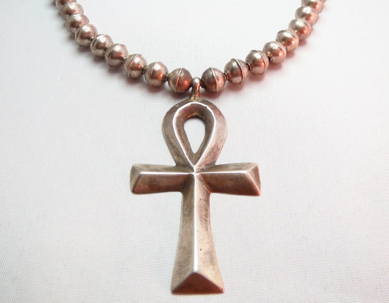 ナバホ族の作品と思われるシルバービーズとキャスト成形のクロストップのみで構成されたビンテージネックレスです。