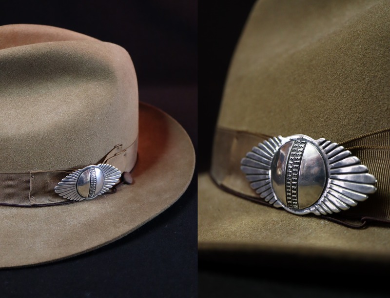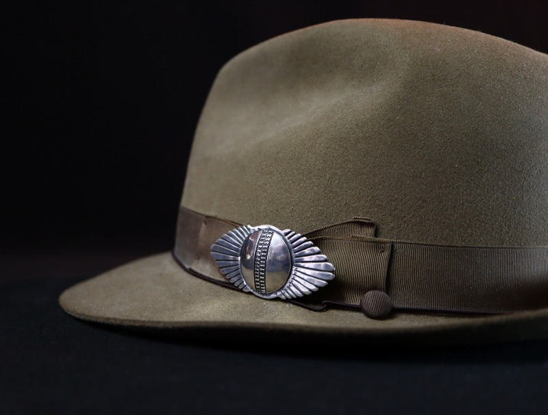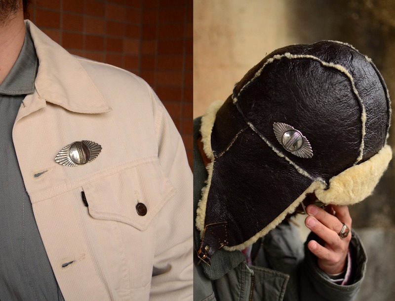 シルバーのみで構成されたソリッドな質感は派手さを生まず、ラペルやハット以外にもコンチョのように使用することも可能で、多くのアイテムに馴染みやすいシンプルなピンブローチです。また、そのウイングを想起させるデザインによってミリタリーアイテムにもフィットする独特の印象を持った作品となっています。
