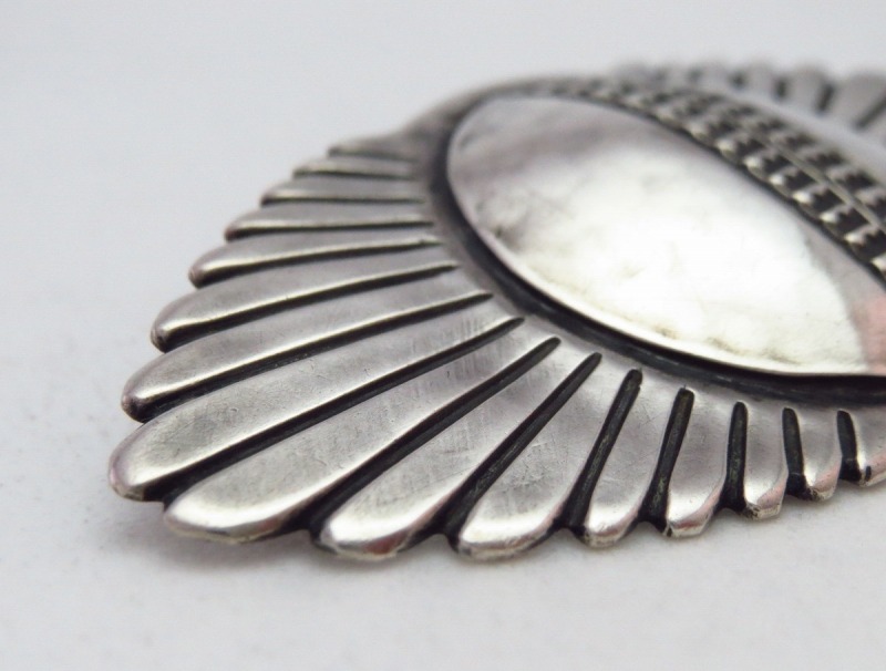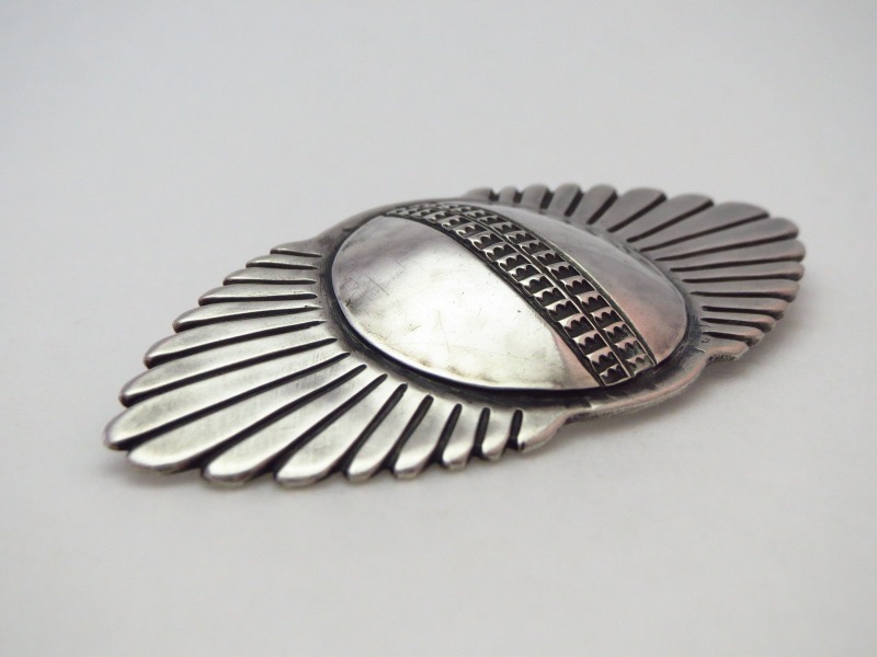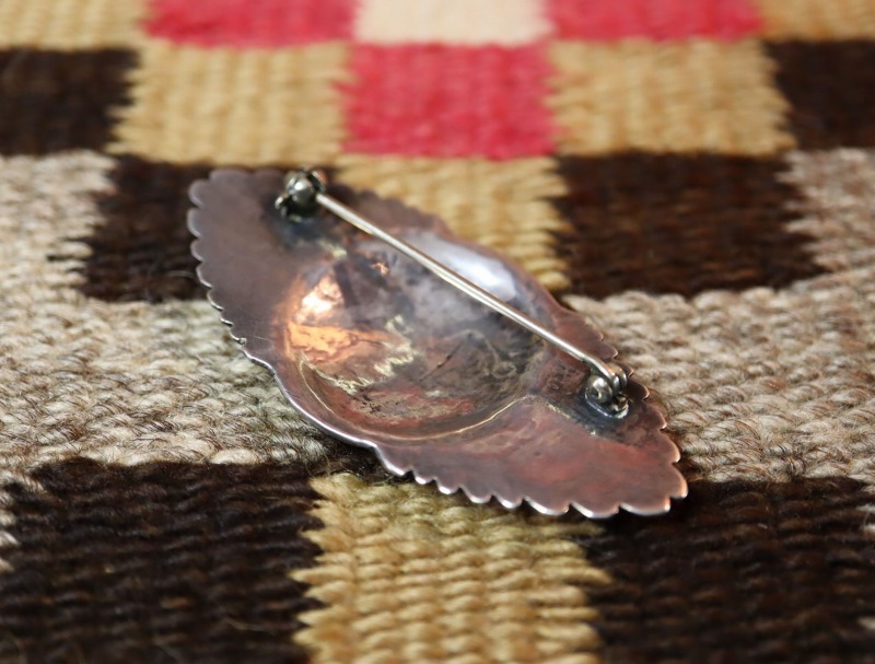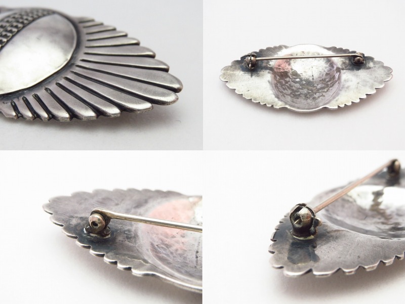 【NAVAJO】ナバホのアンティークジュエリー、ホールマーク(作者や工房のサイン)等が刻印されていない為、正確に作者や背景を特定することは出来ませんが、独特なシェイプや造形スタイル等から『U.S.NAVAJO』の刻印で知られる【Indian Arts & Crafts Board】(IACB)の認証を受けたトレーディングポストやインディアンスクールの彫金クラス、または【The Navajo Arts & Crafts Guild】 (NACG)=通称『ナバホギルド』で制作されたと推測される作品。原始的な技術で形作られていながら、手の込んだシルバーワークや独特な造形センスにより、素晴らしい完成度とオリジナリティが与えられたアンティーク/ビンテージピンブローチです。